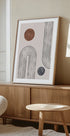 Elegantiškas abstraktus plakatas su stipriomis geometrinėmis formomis, apskritimais ir lenktomis juodomis linijomis smėlio spalvos fone. Įkvėptas amžiaus vidurio modernaus dizaino, šis minimalistinis meno kūrinys sujungia pusiausvyrą, ritmą ir eleganciją, todėl yra universalus kūrinys šiuolaikiniame interjere.