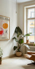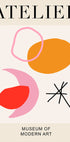 Modernus abstraktus plakatas su ryškiomis raudonos, rožinės ir oranžinės spalvos grafinėmis formomis su juodų linijų detalėmis. Sukurtas minimalistinio stiliaus su tekstu „Atelier – Museum of Modern Art“, šis meno kūrinys atspindi modernaus dizaino esmę ir puikiai dera prie stilingo interjero.