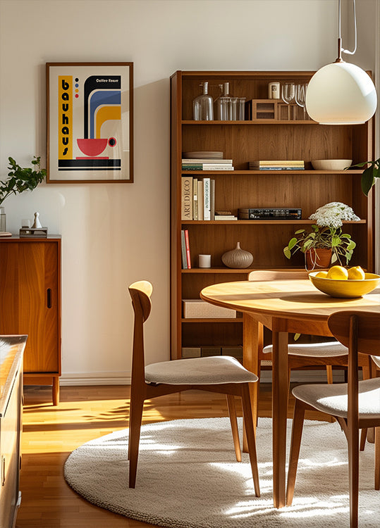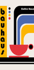 Bauhaus įkvėptas kavos namų plakatas su ryškiomis geometrinėmis raudonos, geltonos, mėlynos ir juodos spalvos figūromis. Abstrakčiame dizaine pavaizduotas gryno Bauhaus stiliaus garuojantis kavos puodelis, kuriame funkcionalumas derinamas su menišku paprastumu. Tobulas sienų menas retro virtuvėms, kavinėms ir senovinio modernizmo mėgėjams.