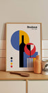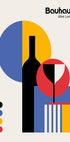 Modernus Bauhaus įkvėptas plakatas su vyno buteliu ir vyno taure, stilizuota ryškiomis geometrinėmis juodos, raudonos, geltonos ir mėlynos spalvos figūromis. Šis abstraktus dizainas sujungia vyno eleganciją su nesenstančia Bauhaus estetika, puikiai tinka barams, virtuvėms, valgomiesiems ir vyno mėgėjams.