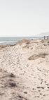 Rami pakrantės nuotrauka, kurioje smėlėtas kelias žemyn link jūros. Minkšti pėdsakai smėlyje, laukinė paplūdimio žolė ir tolumoje tvyrančios jūros bangos sukuria ramią ir nostalgišką atmosferą. Puikiai tinka vasaros ramybei įnešti į bet kurį kambarį.