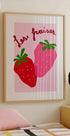 Žaismingas ir gyvas braškinis plakatas su ryškiais raudonais ir rausvais atspalviais bei ranka rašytu prancūzišku tekstu „Les fraises“. Puikiai tinka retro virtuvės dekoravimui, Valentino dienos įkvėpimui ar visiems, kurie mėgsta vaisių meną.