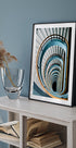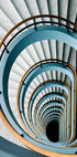 Įspūdinga sraigtinių laiptų nuotrauka, matoma iš viršaus, sukurianti svaiginančią begalybės iliuziją. Šis architektūrinis meno kūrinys savo kreivėmis, geometriniu tikslumu ir modernistine elegancija puikiai atrodo bet kuriame interjere.