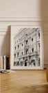 Sudėtinga nespalvota Cartier parduotuvės Niujorke nuotrauka su puošniu fasadu ir nesenstančia architektūrine elegancija. Šis raštas garsina prabangą, paveldą ir dizaino kokybę ir tampa ikoniniu mados, kultūros ir išskirtinių papuošalų pasaulio įkvėpto interjero teiginiu.