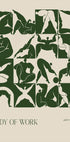 Įspūdingas figūrinis Arty Guavos plakatas (2024 m.) su ryškiomis abstrakčiomis kūno formomis sodriai žalia spalva smėlio spalvos fone. Meno kūrinys tyrinėja formą, judesį ir žmogaus raišką moderniu grafiniu stiliumi.