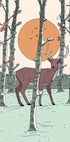 Nicholaso „Deer In The Forest“ yra minimalistinis plakatas, kuriame vaizduojamas išdidus elnias, ramiai stovintis tarp lieknų beržų šerkšno miško kraštovaizdyje. Prislopinti žali ir kreminiai tonai susitinka su grafiškomis linijomis ir švelnia saulės šviesa, sukurdami japonų įkvėptą ramią atmosferą svetainėje, miegamajame ar biure.