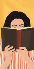 Šilta ir viliojanti moters, giliai įnikusios į knygą, iliustracija sodriame geltoname fone. Dryžuoti marškiniai ir žemės atspalviai suteikia jaukaus, šiuolaikiško žavesio – puikiai tinka skaitymo kampeliams, bibliotekoms ar bet kuriai erdvei, kurioje švenčiamas knygų džiaugsmas.