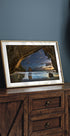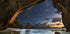 Kvapą gniaužiantis Cathedral Cove vaizdas Naujojoje Zelandijoje, matomas per natūralią uolų arką, kuri sutemose įrėmina vandenyną. Ramios bangos, žėrintys atspindžiai ir žvaigždėtas dangus sukuria magišką atmosferą, puikiai tinkančią pakrantės grožiui ir ramybei įnešti į namus.