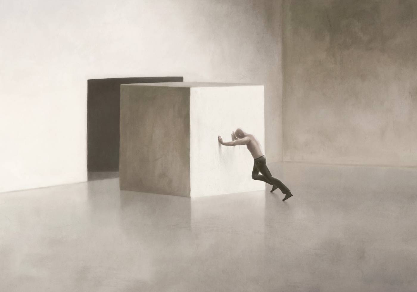 Galingas minimalistinis meno kūrinys, vaizduojantis vienišą figūrą, besislepiančią nuo milžiniško kubo. Šis siurrealistinis vaizdas simbolizuoja kovą, atkaklumą ir gyvenimo iššūkius. Idealus plakatas tiems, kurie vertina gilų, mąstymą skatinantį meną su modernia išraiška.