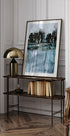 Poetiškas Helenos Ryhle akvarelinis peizažas: pakrantėje rikiuojasi liekni medžiai, jų siluetai atsispindi ramiame vandenyje. Šalti melsvai pilki tonai, lengva migla ir švelnūs teptuko potėpiai sukuria ramią, žiemišką atmosferą su melancholijos dvelksmu – puikiai tinka moderniam, šiaurietiškam dekorui. Sukuria ramybę ir gilumą.