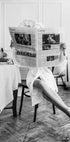 Stilinga juodai balta nuotrauka, kurioje moteris su chalatu ir rankšluosčiu ant galvos elegantiškai skaito laikraštį per pusryčius. Dėl savo rafinuoto paprastumo ir nesenstančios estetikos meno kūriniai atspindi lengvo prašmatnumo esmę, puikiai tinkantį mados įkvėptam interjerui.