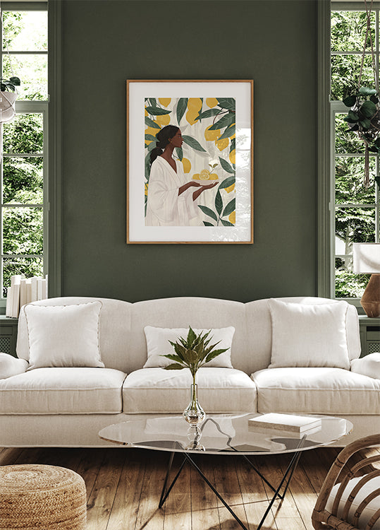 Stilingas ir modernus meno kūrinys, vaizduojantis grakščią moterį citrinų giraitėje, laikančią dubenį šviežių citrinų. Skaidrūs geltoni vaisiai gražiai kontrastuoja su vešliai žaliais lapais ir sukuria ramią bei elegantišką kompoziciją namams ar biurui.