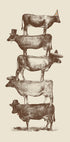 Nuotaikingas ir siurrealistinis vintažinio stiliaus meno kūrinys, vaizduojantis krūvą karvių, kurių kiekviena dėvi skirtingas skrybėles. Žaisminga iliustracija, kurioje dera kaimo nostalgija su niūriu humoru – puikiai tinka sodybos dekoravimui ar eklektiškoms meno kolekcijoms.