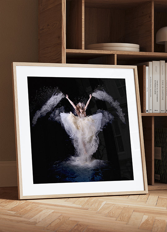 Pauline Pentony „Powder Rush“ užfiksuoja akimirką, kai šokėja pradeda judėti, apsupta pudros debesies, kuri suformuoja į angelą panašius sparnus. Tamsus, dramatiškas fonas pakylėja ryškią figūrą, o šuolis, suknelė ir plunksnų dulkės sukuria poeziją, galią ir nuotykius. Modernus, nuotykių kupinas portretas.