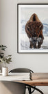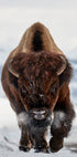 Galinga gamtos nuotrauka, kurioje užfiksuotas stumbras, besiveržiantis per sniegą. Šaltas kvapas ir sniegas ant veido, šis dramatiškas vaizdas įamžina neapdorotą vieno iš labiausiai žinomų Šiaurės Amerikos gyvūnų jėgą, ištvermę ir didingą buvimą.
