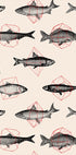 Modernaus meno plakatas su išsamiomis žuvų iliustracijomis, derančiomis su geometrinėmis raudonomis formomis. Kartojimas ir simetrija sukuria unikalų raštą, kuris sujungia gamtą su abstrakčia geometrija, todėl tai yra įspūdingas šiuolaikinio sienų meno kūrinys.