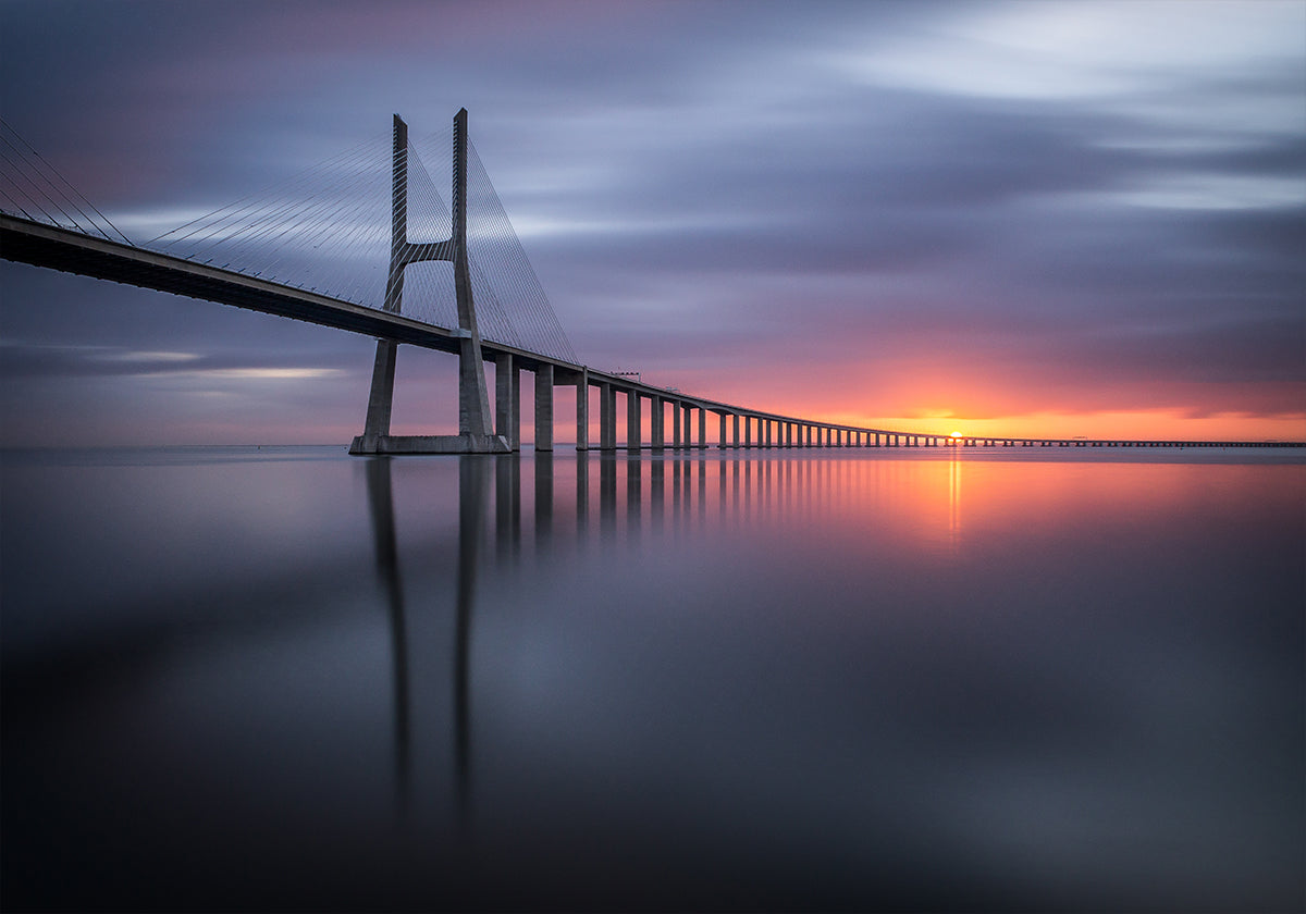 Awaken to the hush of Lisbon's dawn as the Vasco da Gama Bridge stretches across a glassy Tagus, its elegant lines dissolving into pastel clouds. Ricardo Mateus captures a long-exposure calm: silky water, a glowing horizon, and sculptural symmetry that invites quiet reflection and modern space. Perfect for serene, contemporary interiors.