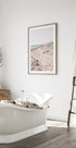 Rāma piekrastes fotogrāfija, kurā redzams smilšains ceļš lejup uz jūru. Mīkstas pēdas smiltīs, mežonīgā pludmales zāle un jūras viļņi tālumā rada mierīgu un nostalģisku atmosfēru. Lieliski piemērots vasaras miera ienesšanai jebkurā telpā.