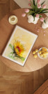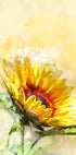 Spilgta saulespuķes akvareļa glezna, kas piepildīta ar tropu vasaras enerģiju. Gleznojošās faktūras un koši dzeltenās ziedlapiņas rada siltumu un prieku, ideāls mākslas darbs botāniskam vai sezonāli iedvesmotam dekoram.