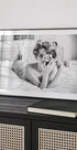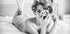 Stilīgs melnbalts plakāts, kurā ir iemūžināts retro stila sievietes portrets ar senlaicīgu matu spolēm, eleganti guļot uz gultas, turot rokās klasisku kameru. Ar jutekliskuma, nostalģijas un mākslinieciskās izteiksmes sajaukumu fotogrāfija izceļ sievietes pievilcību un mūžīgu šarmu.