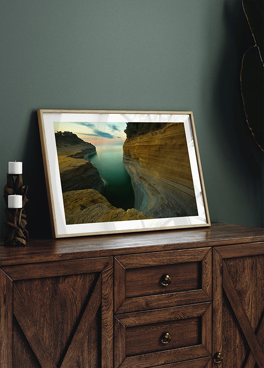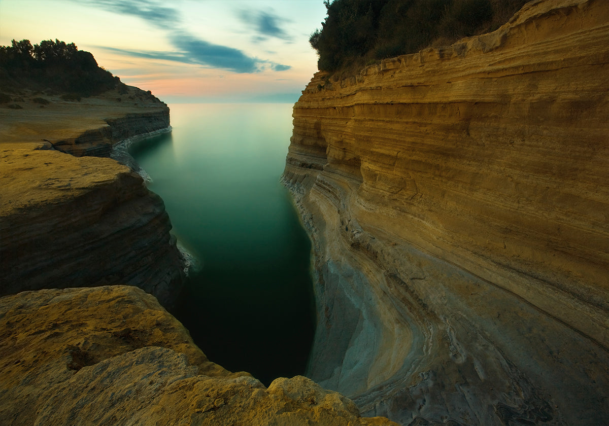 Rāms ilgās ekspozīcijas kadrs no ikoniskā Canal d'Amour Korfu, Grieķijā. Smaragda ūdeņus ierāmē dramatiskas smilšakmens klintis, radot noslēpumainu un romantisku atmosfēru. Šī piekrastes ainava atspoguļo Jonijas jūras dabas skaistumu, mūžīgo mieru un leģendāro šarmu.