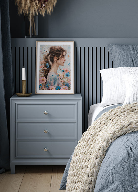 Sapņains akvareļa mākslas darbs ar mierīgu jaunu sievieti, ko ieskauj ziedoši ziedi pasteļtoņos. Smalkie tauriņi un peldošās lapas rada miera un pārdomu sajūtu, kas ir ideāli piemērota harmoniskas un iedvesmojošas atmosfēras radīšanai.