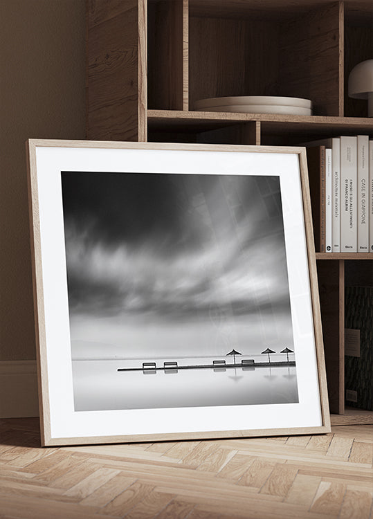 Džordža Digalaka četri soliņi un trīs lietussargi ir poētiska, vienkrāsaina meditācija pie ūdens: četri tukši soliņi ir vērsti pret spoguli līdzīgu jūru, bet trīs saulessargi ritmiski iezīmē horizontu. Vienkāršība, simetrija un kluss atspulgs rada mierīgu un grafisku līdzsvaru telpā. Lieliski piemērots mūsdienīgam, minimālisma stilam.