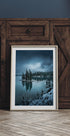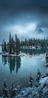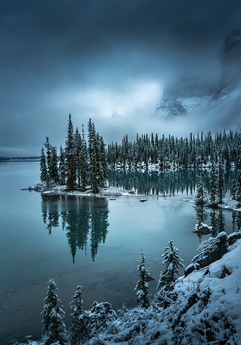 Mākslinieka Bing Li raisoša ziemas ainava rītausmā: migla plūst pāri spoguļveidīgam, ledus ieskautam ezeram, kurā atspoguļojas egļu un sniegotu kalnu silueti. Vēsās debesis mainās no dziļi zilas uz maigi rozā. Mierīga, poētiska aina, kas aicina uz pārdomām un klusām pārdomām. Lieliski piemērots ziemas noskaņojumam.