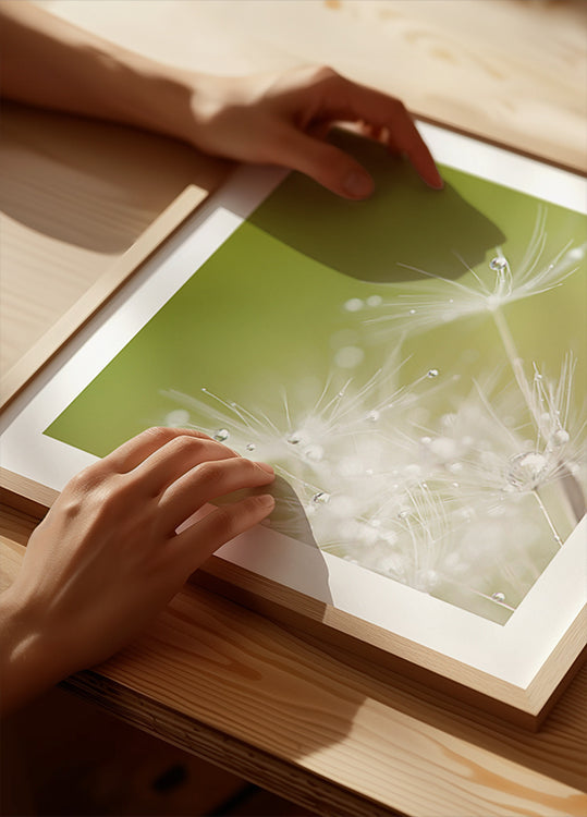 Hildes Ghesquiere Green ir mierīgs makro izskats, kurā kristāldzidri ūdens pilieni balansē uz smalkas, baltas spalvas un mirdz kā mazas pērles miglainā, maigi zaļā gaismā. Minimālisma motīvs tver klusu dabas dramatismu un rada poētisku, meditatīvu atmosfēru, kas aicina uz klātbūtni un mieru. Lieliski piemērots mierīgam, skandināviskam izskatam.
