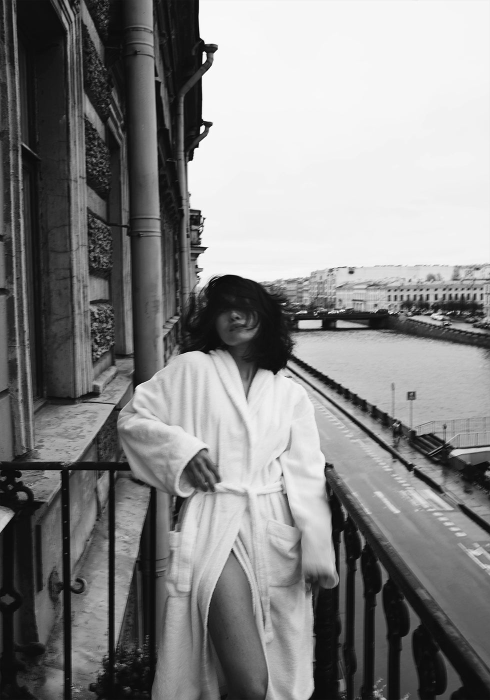 Stilīga melnbalta fotogrāfija, kas iemūžina rīta mirkļa eleganci uz Parīzes stila balkona. Figūra peldmētelī izstaro bez piepūles stilu un intimitāti ar pilsētu un upi kā mierīgu fonu. Lieliska sienu māksla tiem, kam patīk mode, fotogrāfija un mūžīga pilsētas estētika.