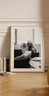 Eleganta melnbalta fotogrāfija, kurā sieviete atpūšas ar dvieli, kas aptīta ap matiem, lasot žurnālu Vogue. Mākslas darbs tver greznas mierīgas un bez piepūles izsmalcinātības mirkli, kas ir lieliski piemērots interjeram, ko iedvesmojusi mode, skaistums un moderna elegance.