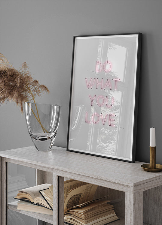 Neon Dreams fanger nattens puls: på en mørk grå baggrund lyser et blødt pink neon-citat som et skilt fra byen og tegner en varm aura af kærlighed og nærvær. Den minimalistiske typografi gløder med lette refleksioner og skaber en grafisk, romantisk stemning – perfekt som blikfang i stue, soveværelse eller kontor.