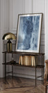 Mierīgs, abstrakts motīvs dziļi zilos toņos, kur vertikālas, plūstošas līnijas veido saltu plūsmu pāri attēlam. Vienkrāsainā palete rada vēsu, modernu noskaņu, savukārt maigās kustības rada līdzsvaru un dziļumu. Lieliski piemērots minimālisma telpām, kas meklē stilīgu mieru, vai kā kontrastu siltā interjerā.