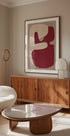 En moderne, abstrakt komposition af Vitor Costa, hvor dybe røde geometriske former danser mod en blød beige baggrund. Kontrasten mellem skarpe vinkler og organiske kurver skaber rolig spænding, mens subtile akvarelteksturer giver varme. Perfekt til minimal og midcentury indretning. Et grafisk statement, der samler rummet.