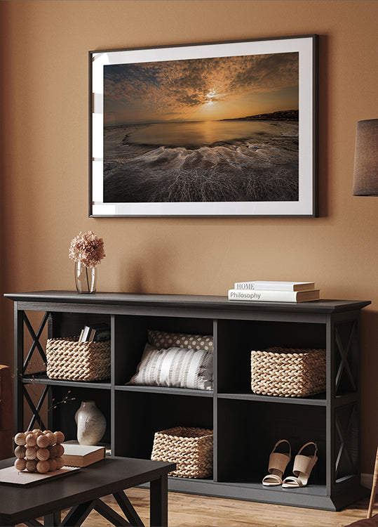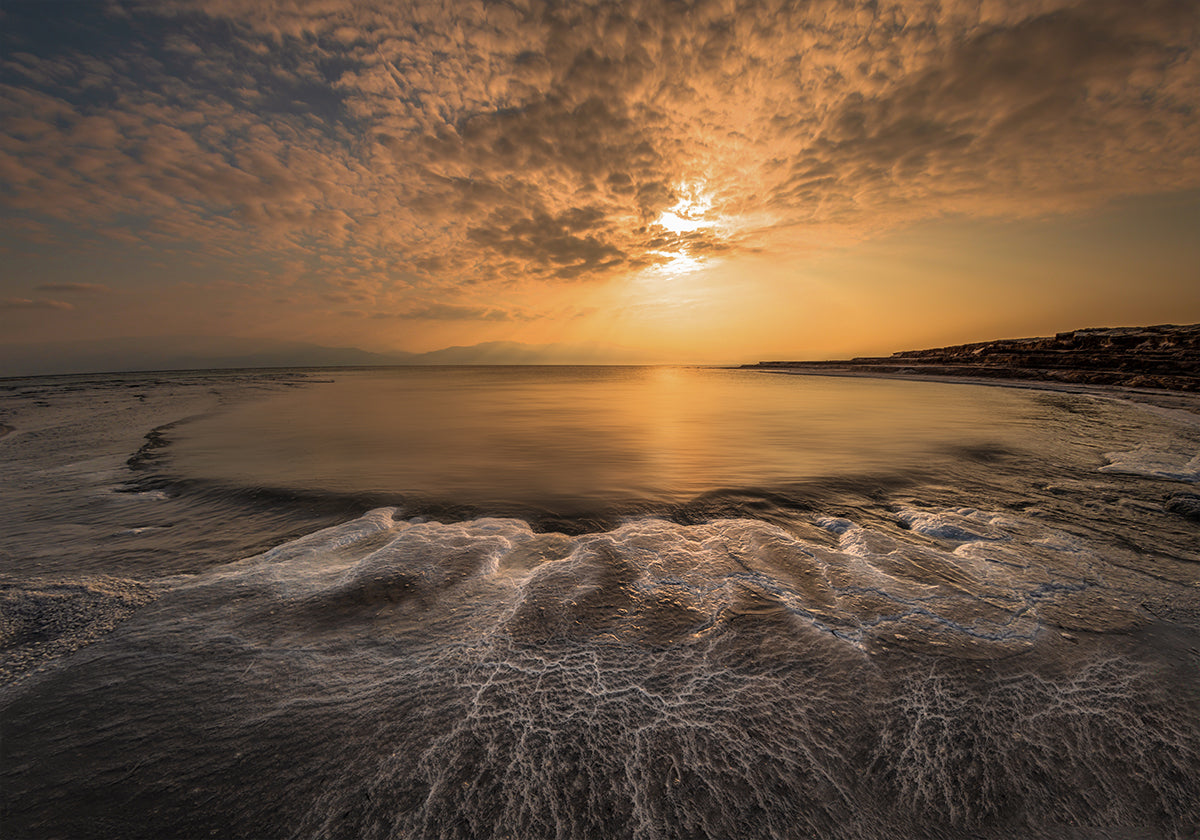 Isama Telhami sāls struktūra ļauj klusajam jūras ritmam piepildīt telpu: maigi viļņi skalojas pār smalku, vieglu smilšu pludmali, kur sāls zīmē smalkus rakstus gar ūdens malu. Virs horizonta plūst smagi mākoņi klusinātā zilā un smilšu krāsās. Mierīgs, minimālistisks motīvs, kas aicina uz pārdomām.