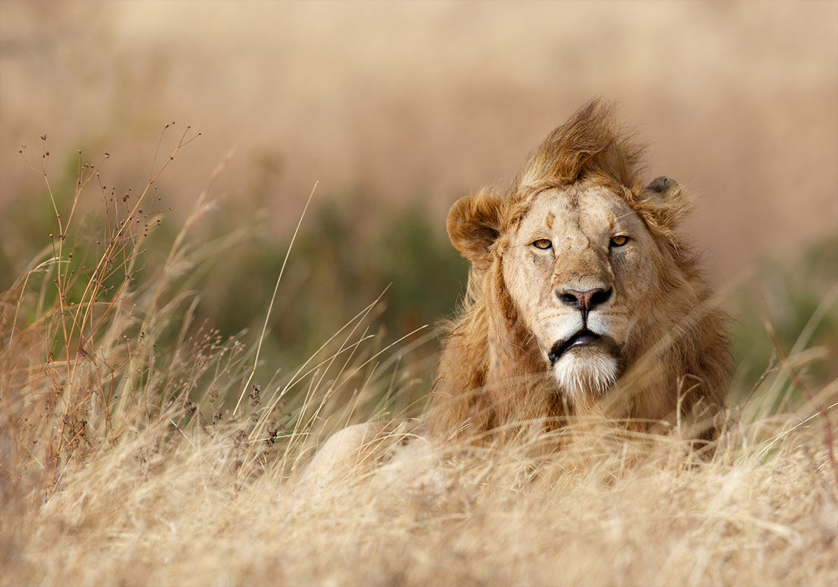 Valdošs un mierīgs lauvas tēviņš stāv vēja plosītā savannas zālē, viņa krēpes plīvo kā liesma, kamēr mīkstais bokehs kausē Serengeti zeltā. Katrs ūsas un dzintara skatiens apliecina savvaļas kluso autoritāti. Šo portretu Tanzānijā iemūžinājis fotogrāfs Ali Khataw, un tas vainago jebkuru telpu ar nepieradinātu majestātiskumu.