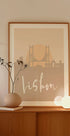 Opdag Lissabon i jordnære nuancer: en stilren skyline-illustration af Emiliano Deificus, hvor byens kuperede silhuet, røde tage og havn mødes i grafiske former. Subtile tekstdetaljer fremhæver metropolens puls og rejseglæde, og gør plakaten perfekt til både stue og kontor. Inspireret af byens historiske kvarterer og rolige, jordfarvede toner.