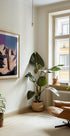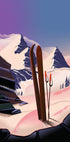 Retro iedvesmots slēpošanas plakāts maigos pasteļtoņos: saulriets krāso debesis, bet sniegotas virsotnes paceļas virs plašās Alpu nogāzes. Stilizēts slēpotājs ar nūjām izgriež taku cauri baltajam, aicinot Eiropas slēpošanas atmosfēru, piedzīvojumiem un ziemas mieru. Nikolaja ilustrācija. Lieliski piemērots slēpošanai visu gadu.
