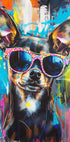 Spilgts ielu mākslas popārta portrets, kurā attēlots Čivava ar krāsainām saulesbrillēm, kas apgleznotas ar drosmīgiem grafiti iedvesmotiem triepieniem. Šis rotaļīgais un modernais mākslas darbs apvieno humoru, stilu un pilsētas enerģiju, lai pievienotu jautru un nervozu noskaņu jebkurai telpai.