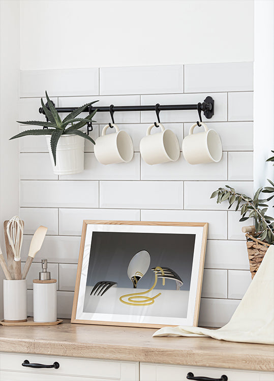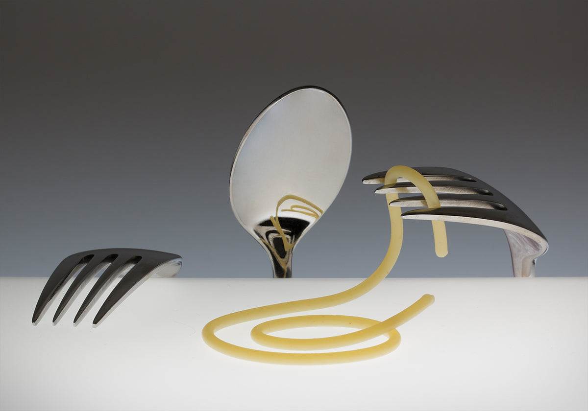 Rotaļīga klusā daba, kurā dakšiņas, karote un spageti pavediens veido humoristisku kompozīciju. Galda piederumi ir izkārtoti kā figūriņas, savukārt makaroni darbojas kā plīvojoši mati. Šis asprātīgais mākslas darbs sajauc ēdienu un fantāziju, pārvēršot ikdienas maltīti sirreālā, mākslinieciskā portretā.
