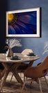 Satriecoša makro fotogrāfija ar ziedu dziļi zilā un purpursarkanā krāsā ar koši dzeltenu centru. Smalkās detaļas ziedlapiņās, ziedputekšņos un faktūrās rada intīmu un māksliniecisku tuvplānu, kas izstaro eleganci un vasarīgu siltumu.