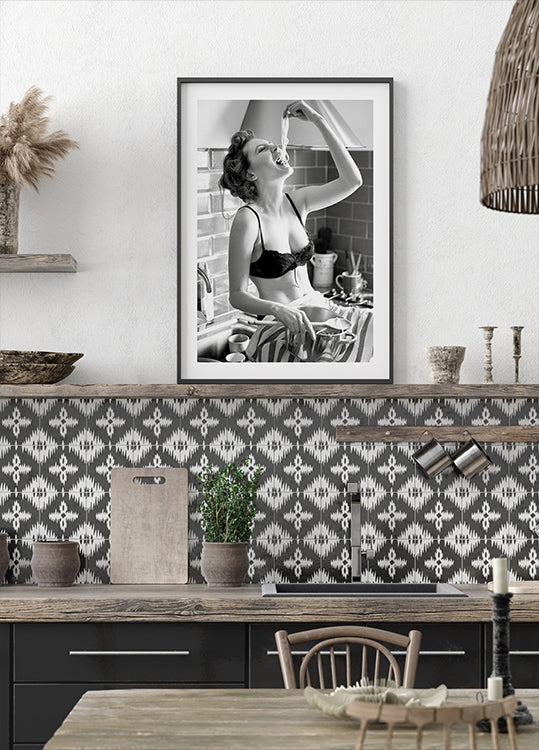 O fotografie alb-negru jucăușă și îndrăzneață a unei femei care se bucură de spaghete într-o bucătărie de inspirație vintage. Cu o atitudine relaxată, ea emană încredere și umor, făcând din această lucrare de artă un plus elegant și distractiv pentru interioarele moderne. Perfect pentru decorul bucătăriei, gurmanzii și pasionații de fotografie.