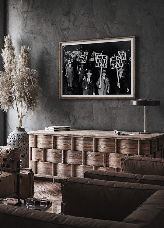 O fotografie vintage alb-negru remarcabilă care surprinde un protest istoric din epoca Prohibiției. Protestatarii țin pancarte pe care scrie „Vrem bere”, un simbol puternic al cererii publicului de alcool la începutul secolului al XX-lea. Perfectă pentru pasionații de istorie, fotografie vintage și decor unic de bar.