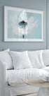O fotografie macro delicată a unei flori albe cu detalii în nuanțe de turcoaz care creează o dispoziție de vis și eterică. Focalizarea fină și culorile pastelate evocă calm și eleganță, făcând lucrarea ideală pentru interioare care caută armonie și frumusețe rafinată.