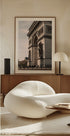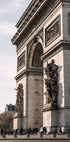 O imprimare fotografică detaliată a Arcului de Triumf din Paris, care arată sculpturile monumentale, inscripțiile și designul neoclasic. Capturată de la nivelul străzii, cu oameni la picioare, opera de artă evidențiază atât măreția reperului, cât și locul său în viața de zi cu zi a orașului.