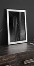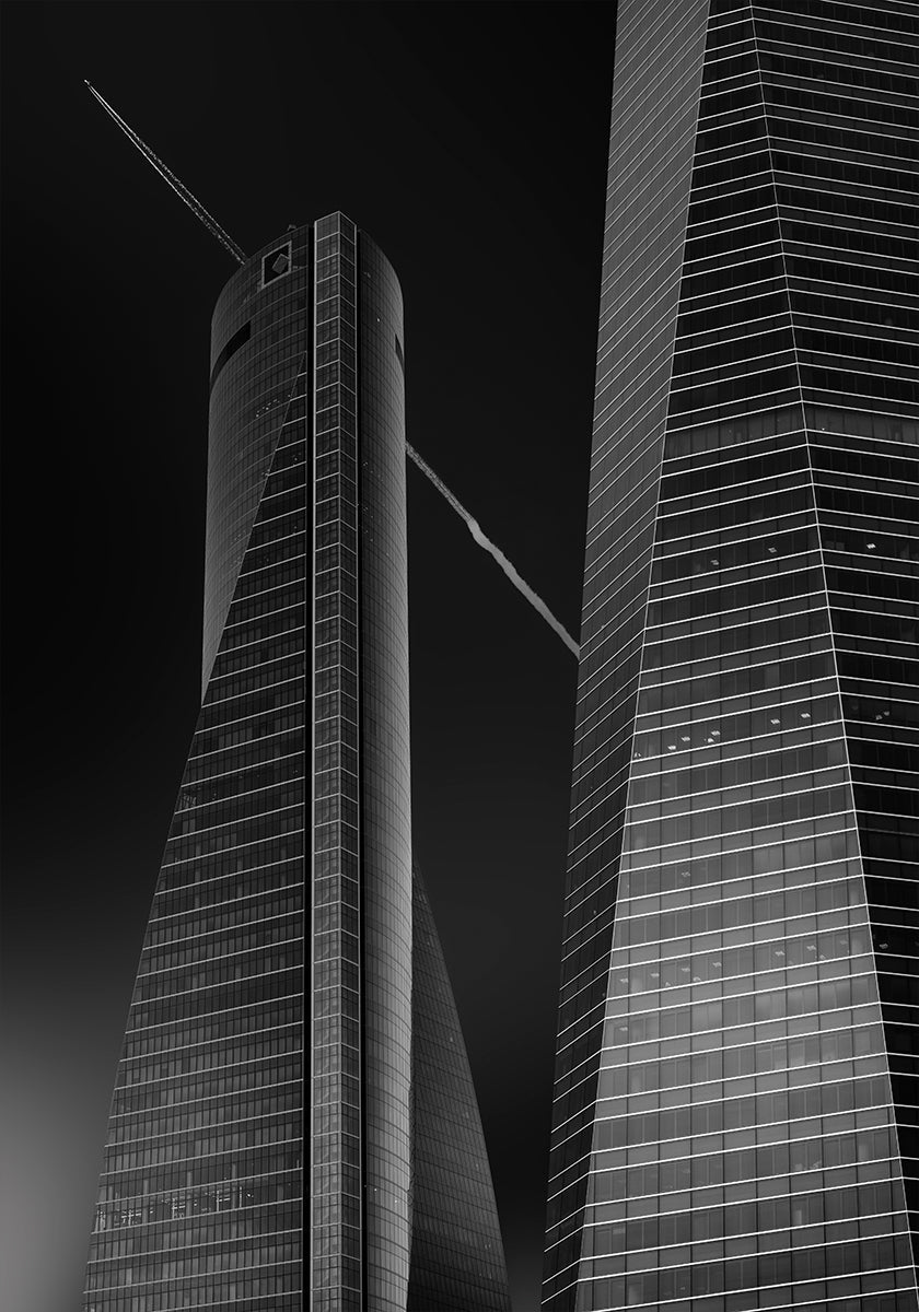 Bon voyage!! af Jorge Ruiz Dueso fanger Madrids puls i dramatisk sort/hvid: et fly skærer gennem himlen over en by af kupler og skyskrabere, hvor klassiske facader møder CTBA’s rene linjer. En grafisk, tidløs cityscape, der kombinerer rejselyst, storbyro og arkitektonisk poesi i ét blik. Motivet hylder Madrid fra gadeplan til skyline.