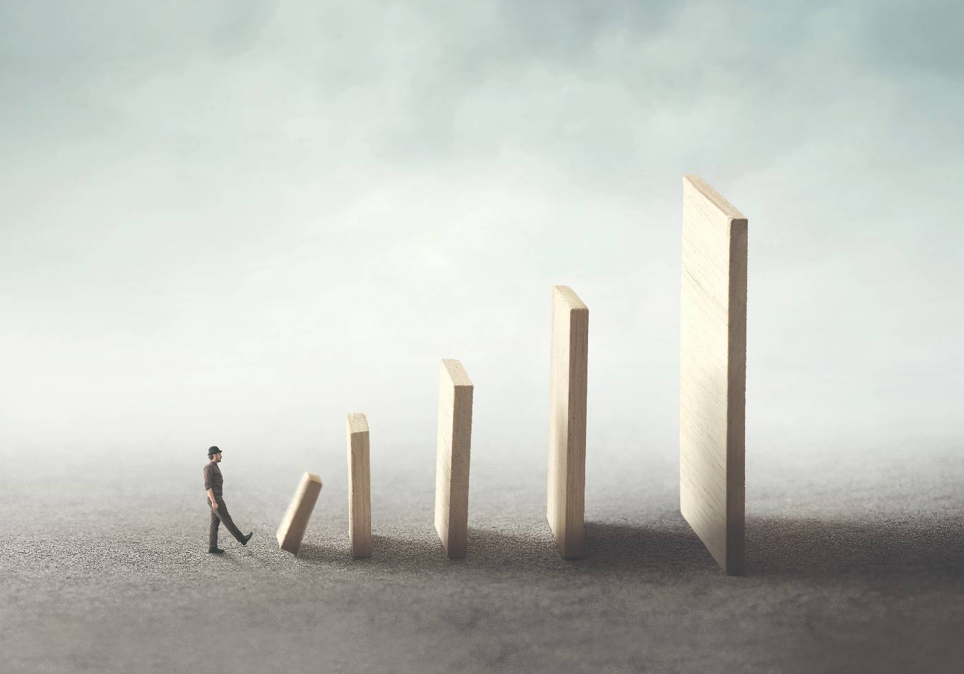 O metaforă vizuală suprarealistă – un omuleț împingând prima dintre multele piese de domino în creștere. O imagine puternică a modului în care acțiunile mici pot duce la consecințe mari – ideală pentru spații de reflecție sau motivaționale.