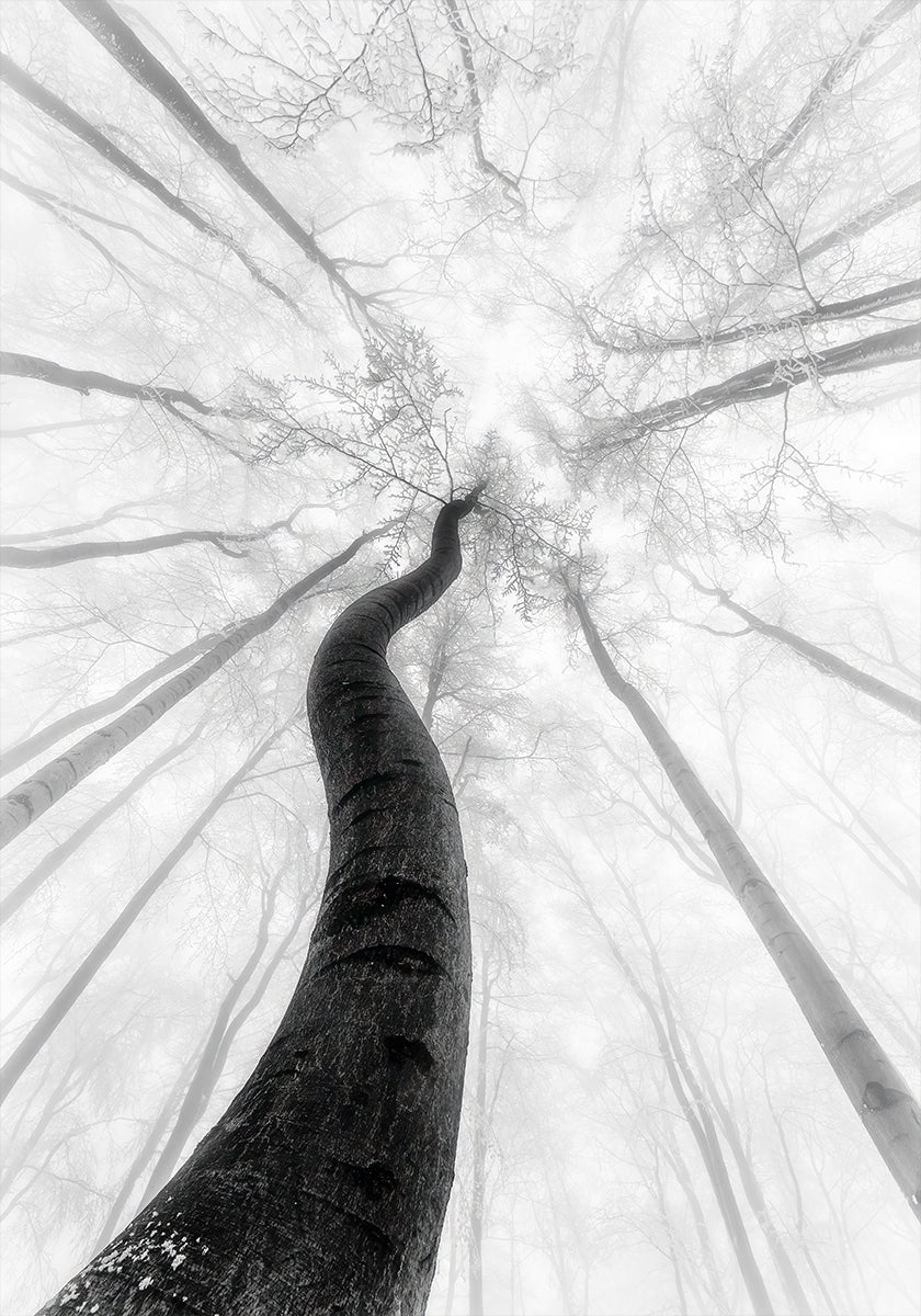 Un moment de iarnă liniștit surprins de fotograful Tom Pavlasek: fagi zvelți stau în zăpadă, învăluiți în ceață și îngheț. Tonurile moi de gri și alb creează profunzime și calm, în timp ce tulpinile repetate desenează linii grafice în peisaj. O atmosferă minimalistă, nordică pentru casă. Perfect pentru camerele care caută claritate, liniște și natură.