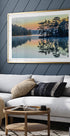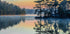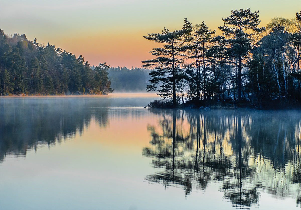 O scenă liniștită a lacului în zori, surprinsă în Suedia, cu ceața care se ridică peste apa liniștită. Reflecția pinii strălucește în lumina blândă a soarelui și creează o atmosferă calmă și meditativă, plină de pace și armonie.