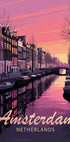 Un motiv atmosferic din Amsterdam: un canal liniștit cu bărci mici care planează sub un pod clasic, flancat de case înguste cu frontoane, în tonuri calde și copaci verzi. Într-o expresie retro elegantă, Andreas Magnusson surprinde farmecul atemporal al orașului, pofta de călătorie și viața de zi cu zi - o atragere a ochilor care creează calm și prezență.